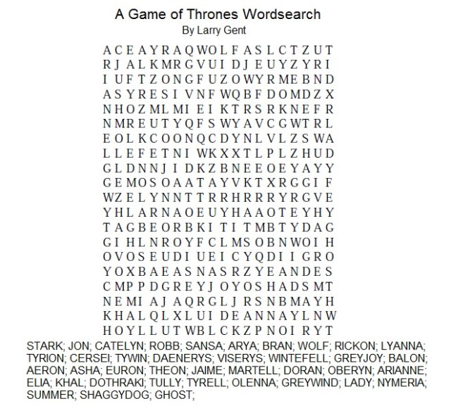 The books have always been popular but on Sunday the long awaited pilot for HBO Game of Thrones was released and with much success. So much so that it was signed for a second season after just one episode. So I made a word search for y’all. A crossword is coming but like all other things involving the Song of Ice and Fire, you’ll have to wait.