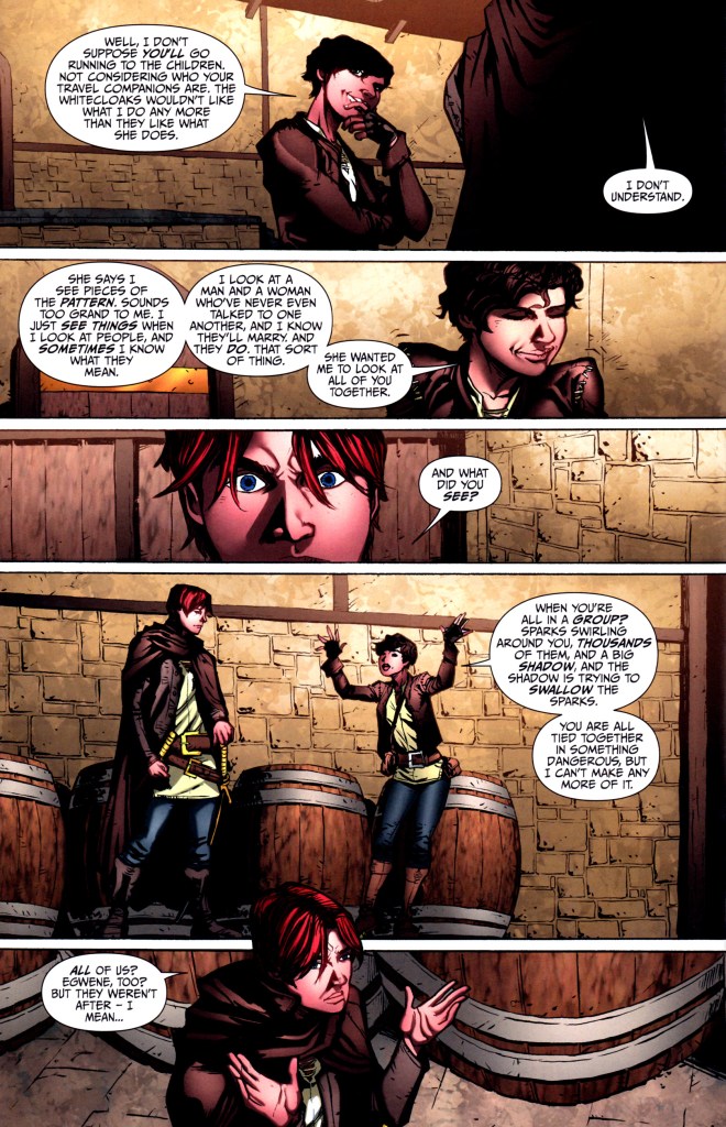 The Eye of the World (EotW) is a long book that spans numerous pages, and heavily focuses on a handful of characters. Dixon is used to working with a large number of characters, his years within the Bat-family make sure of it, and it shows in the EotW adaptations. He is able to give each character the focuses they need so not to lose crucial development in the limited comic space. Dixon is also skilled at finding the natural breaks in the story to end each issue, leaving us with a nice hanger form month to month without it seeming forced.