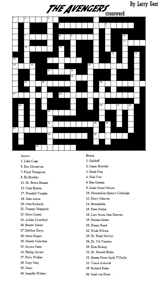 This crossword is different. I have given you a name…a regular everyday name, like say Jessica Drew. You fill in the super-hero name that they use. – Spider-Woman. Simple? In theory yes. I’ve decided to span the Avangers line up from classic, to New Avengers, Sectret Avengers, Mighty, Avengers: Initiative, Dark Avengers, and Even Great Lakes Avengers. So if it has, had or will have the word Avengers in it, its fair game. Fair warning though, heroes use different names and some even rotate names. So be careful. Avengers Assemble!
