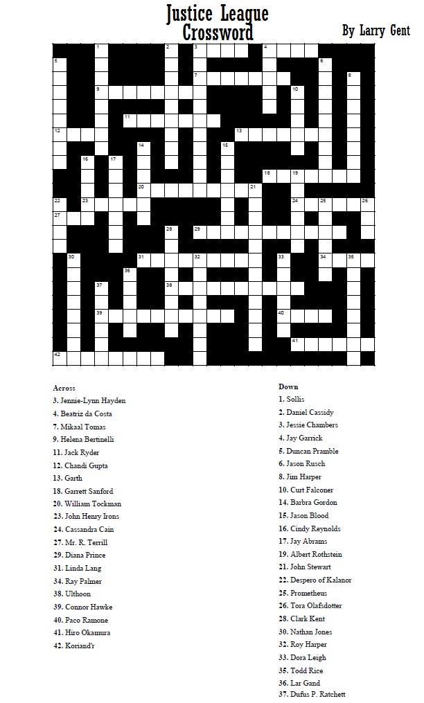 This crossword is different. I have given you a name…a regular everyday name, like say Timothy Drake. You fill in the super-hero name that they use. – Robin. Simple? In theory yes. I’ve decided to span the JLA line up from classic, to JL: Detroit, JL:International, JL: Dark and Even JL: Antarctica. So if it has, had or will have the word Justice League in it, its fair game. Fair warning though, heroes use different names and some even rotate names. So be careful. If you need help call out. The Justice League is always there.