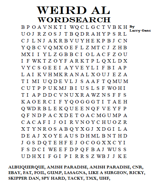 From his first CD in 1983 to Bad Hair Day, Even Worse, Straight otta Lynwood and Alpocalypse – Weird Al has given us some of the best music, both parodies and not, that has ever hit the airwaves. To celebrate his release I give the Weird Al Wordsearch!